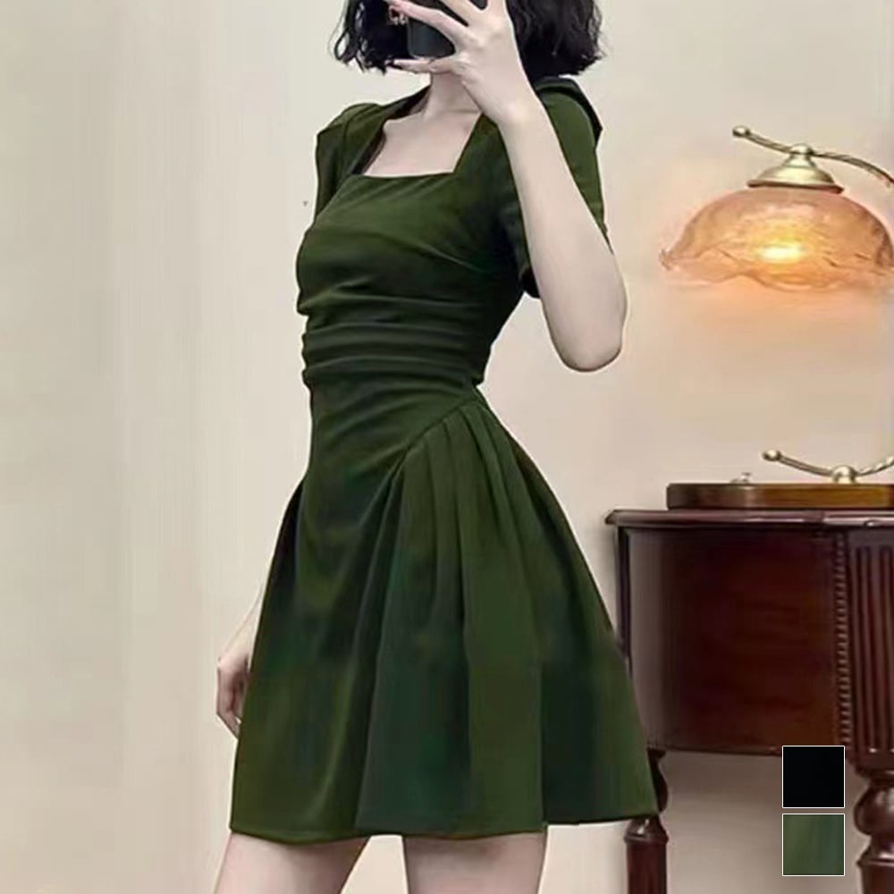 フレアワンピース 着やせ ハイウエスト ギャザーワンピ きれいめカジュアル 大人可愛い ショート丈ワンピ スクエアネック