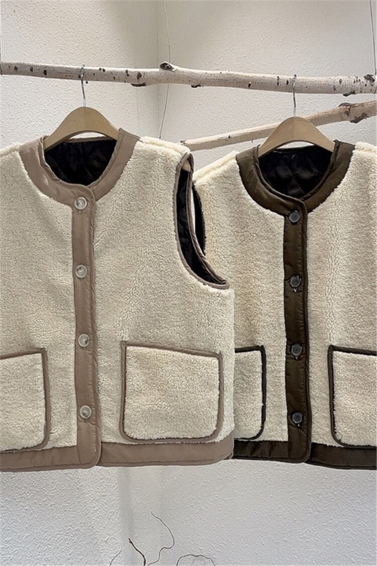レトロ ヒットカラー 縫付 子羊の毛 両面の着用 単体ボタン 暖かい ベスト トレンド